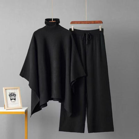 - The set includes: an elegant turtleneck poncho paired with wide-leg lounge trousersĀ