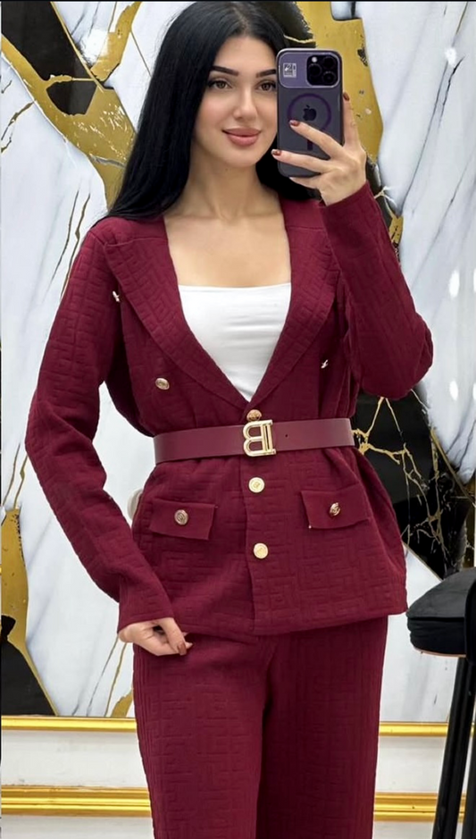 Luxurious suit with a geometric pattern and belt
